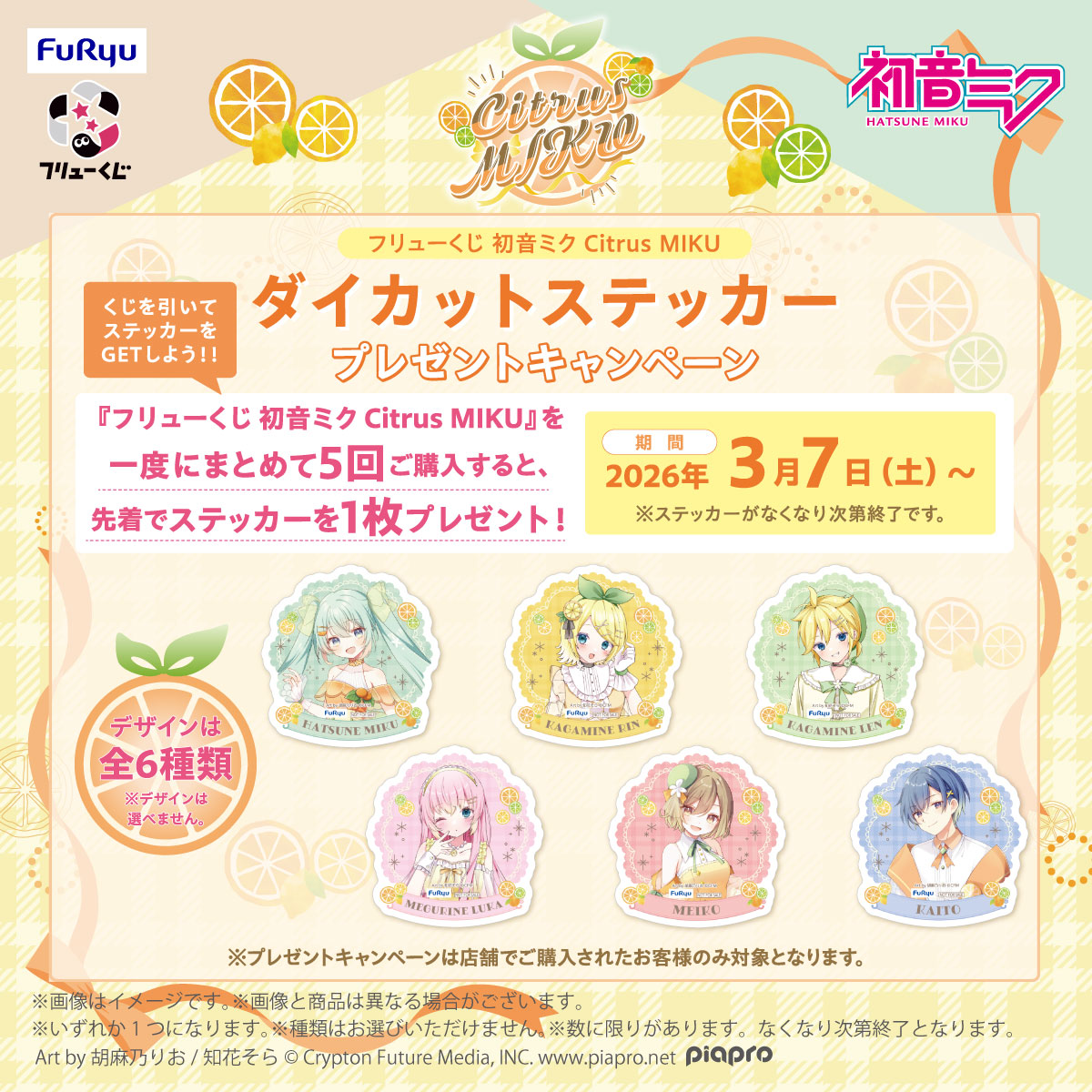 『フリューくじ 初音ミク Citrus MIKU』を一度にまとめて5回ご購入すると、先着でステッカーを1枚プレゼントいたします。